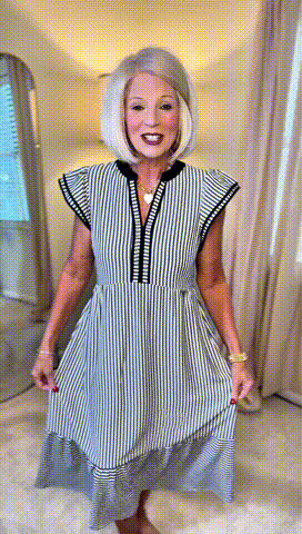 Striped dress in color block style, stylish and eye-catching! With its elegant V-neck and ruffled sleeves, this dress blends classic and trendy design, making it the perfect choice for spring and summer, creating a stylish and casual summer look!